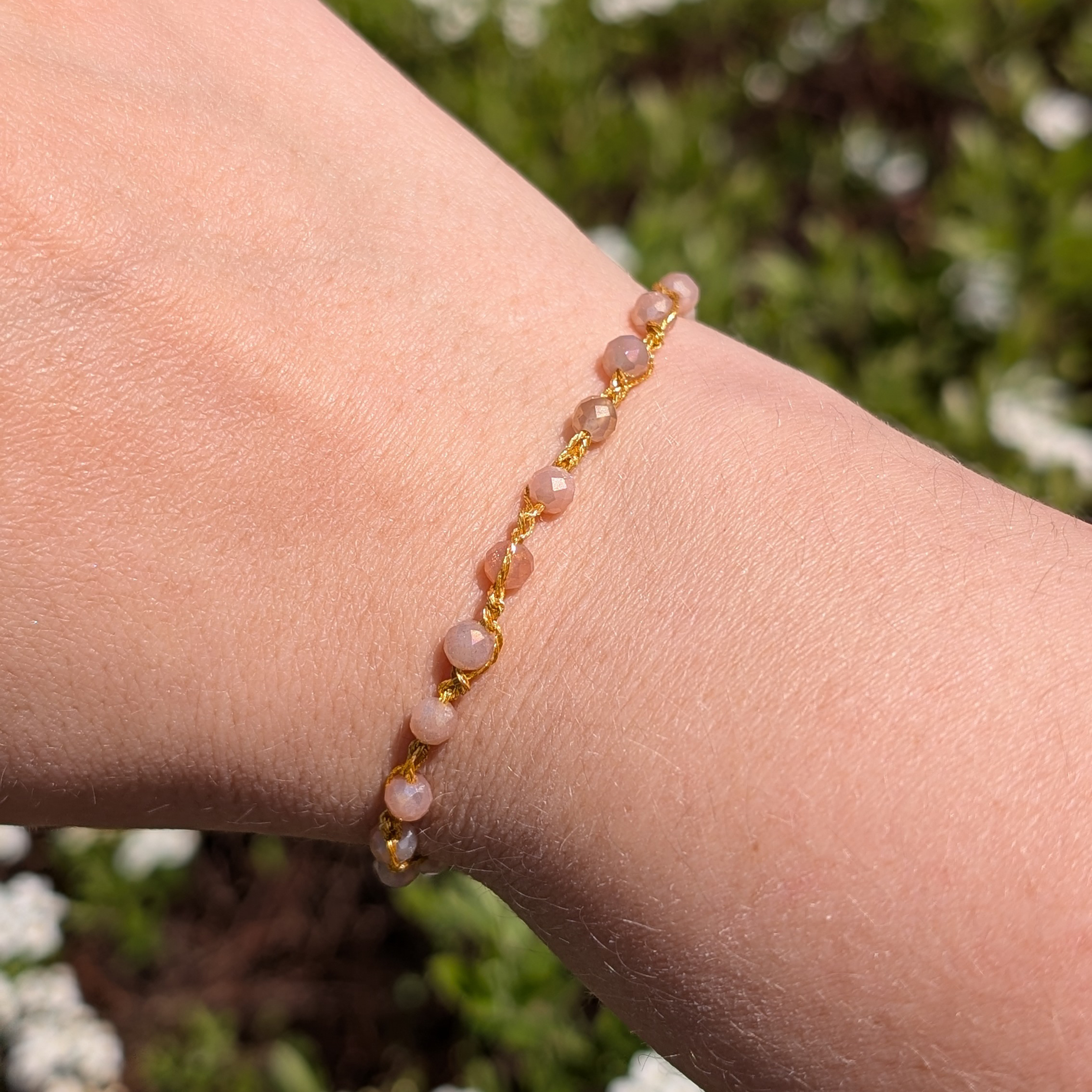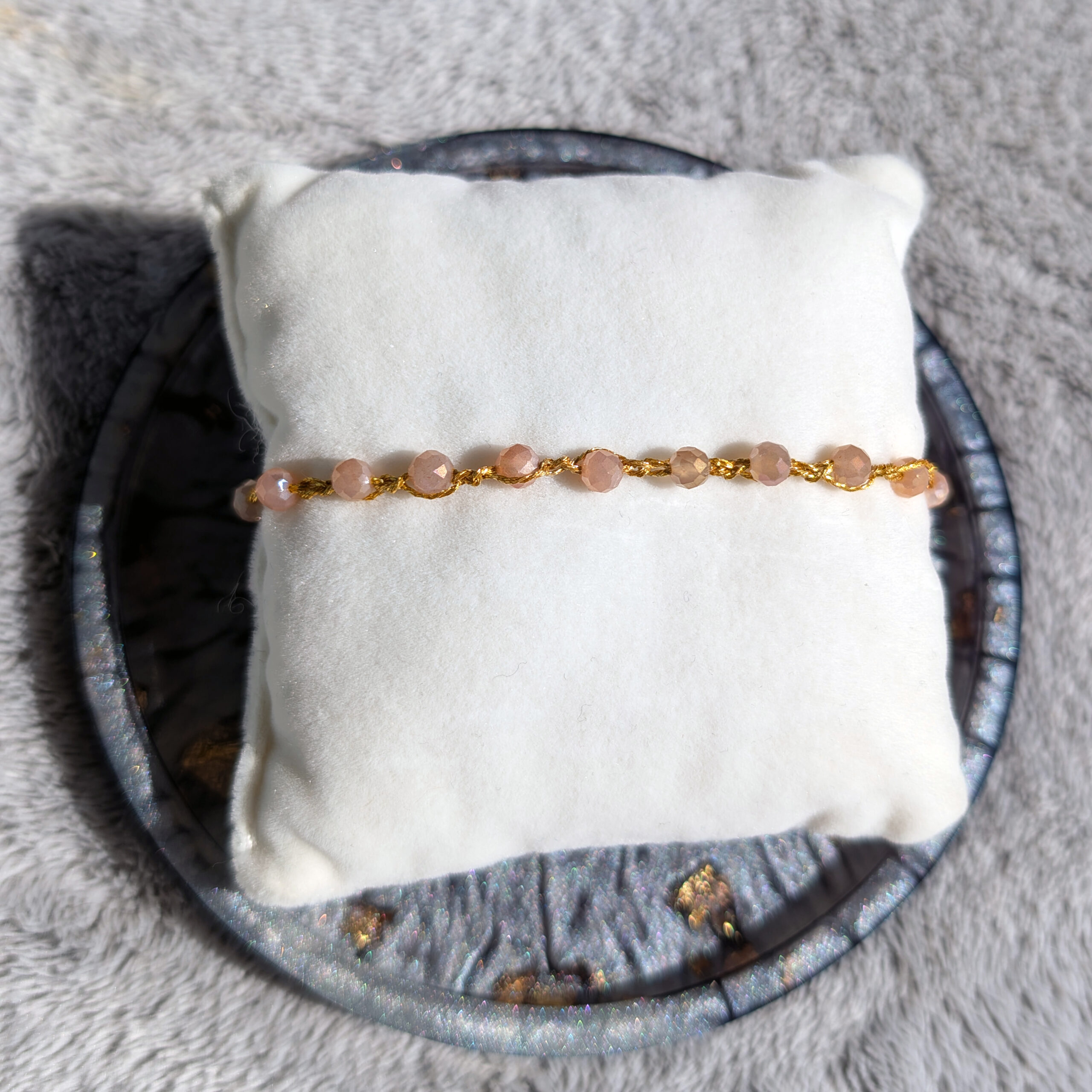 Bransoletki są wykonane ręcznie na cienkim szydełku z nici metalizowanych i kamieni naturalnych lub szklanych koralików. Posiadają elementy ze stali chirurgicznej (zapięcia, przekładki).