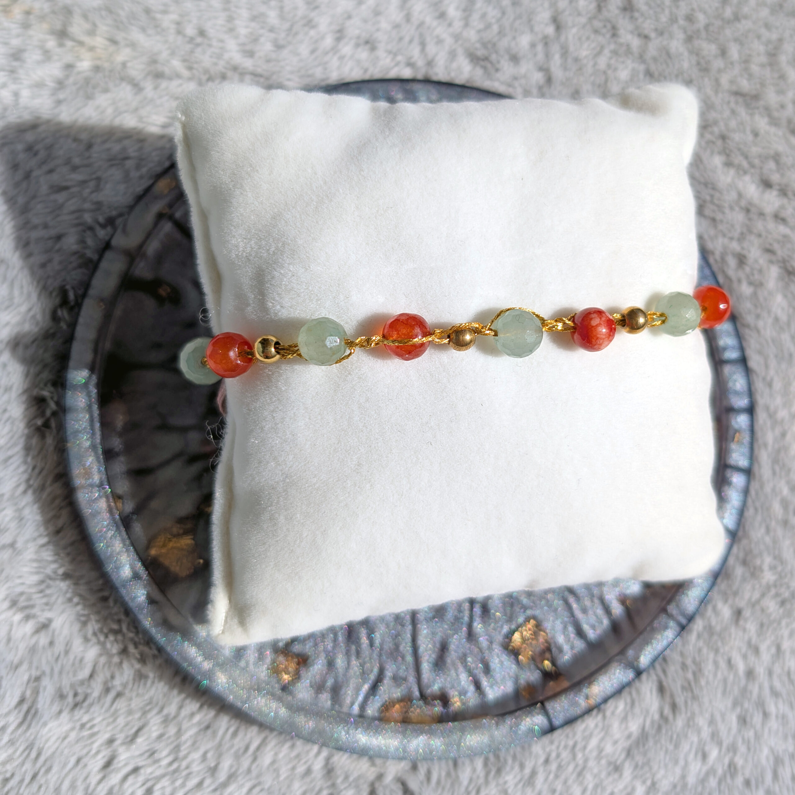 Bransoletki są wykonane ręcznie na cienkim szydełku z nici metalizowanych i kamieni naturalnych lub szklanych koralików. Posiadają elementy ze stali chirurgicznej (zapięcia, przekładki).