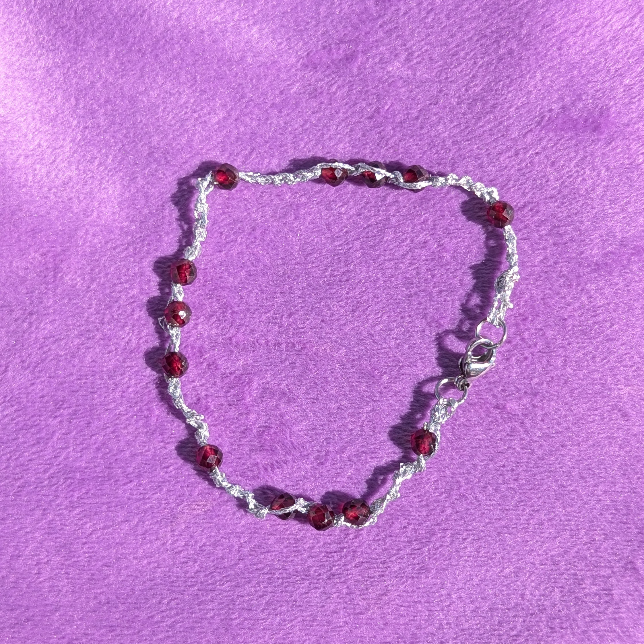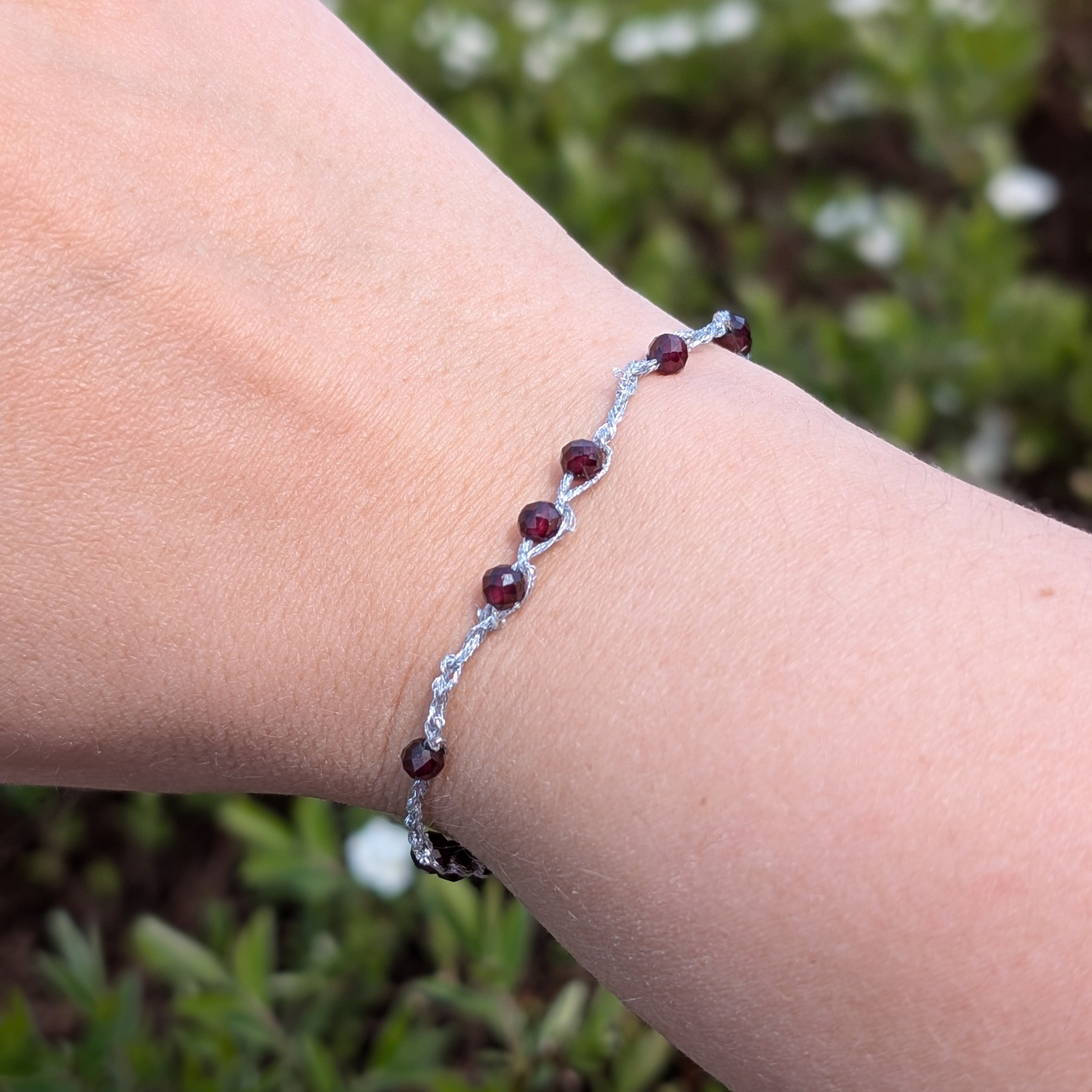 Bransoletki są wykonane ręcznie na cienkim szydełku z nici metalizowanych i kamieni naturalnych lub szklanych koralików. Posiadają elementy ze stali chirurgicznej (zapięcia, przekładki).