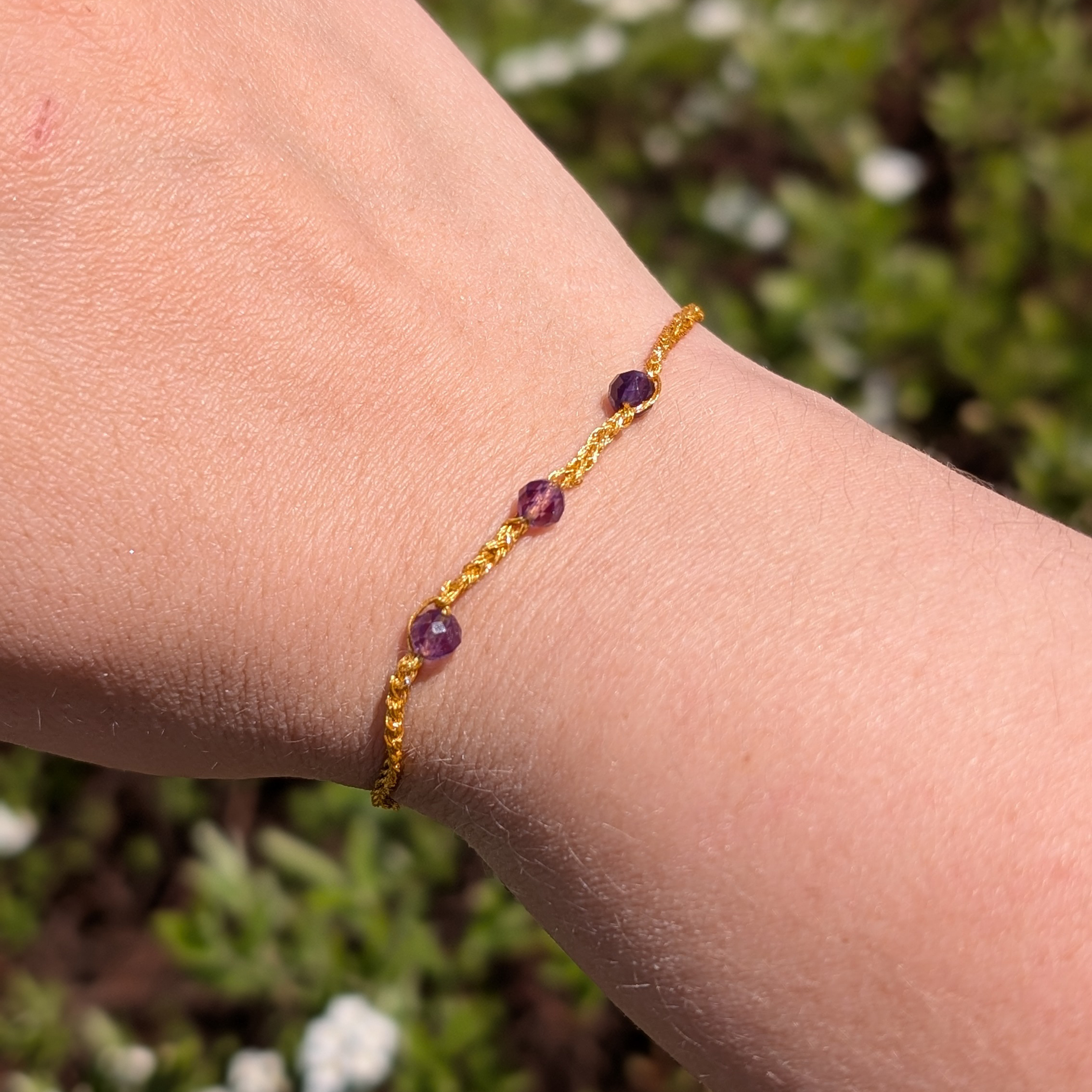 Bransoletki są wykonane ręcznie na cienkim szydełku z nici metalizowanych i kamieni naturalnych lub szklanych koralików. Posiadają elementy ze stali chirurgicznej (zapięcia, przekładki).