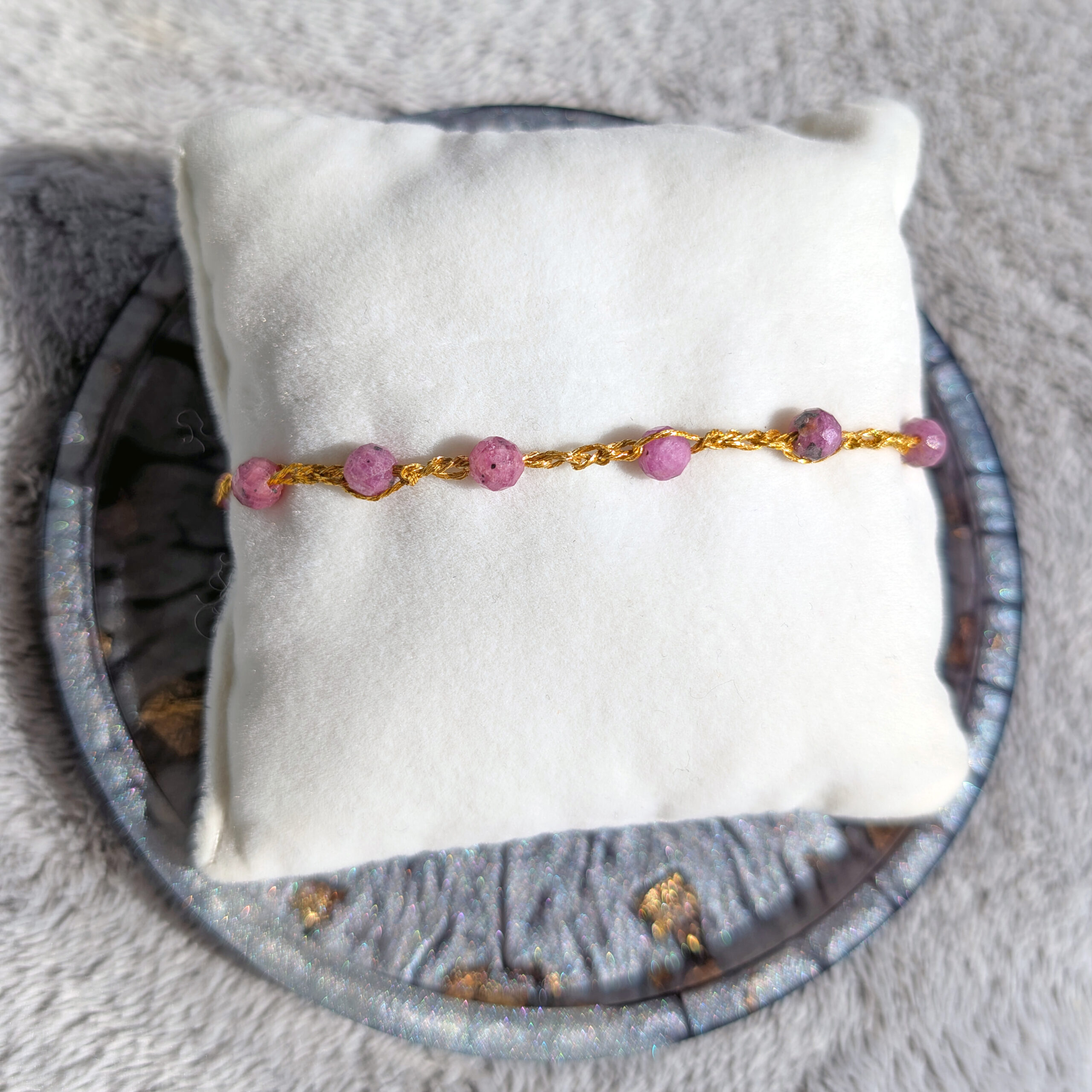 Bransoletki są wykonane ręcznie na cienkim szydełku z nici metalizowanych i kamieni naturalnych lub szklanych koralików. Posiadają elementy ze stali chirurgicznej (zapięcia, przekładki).