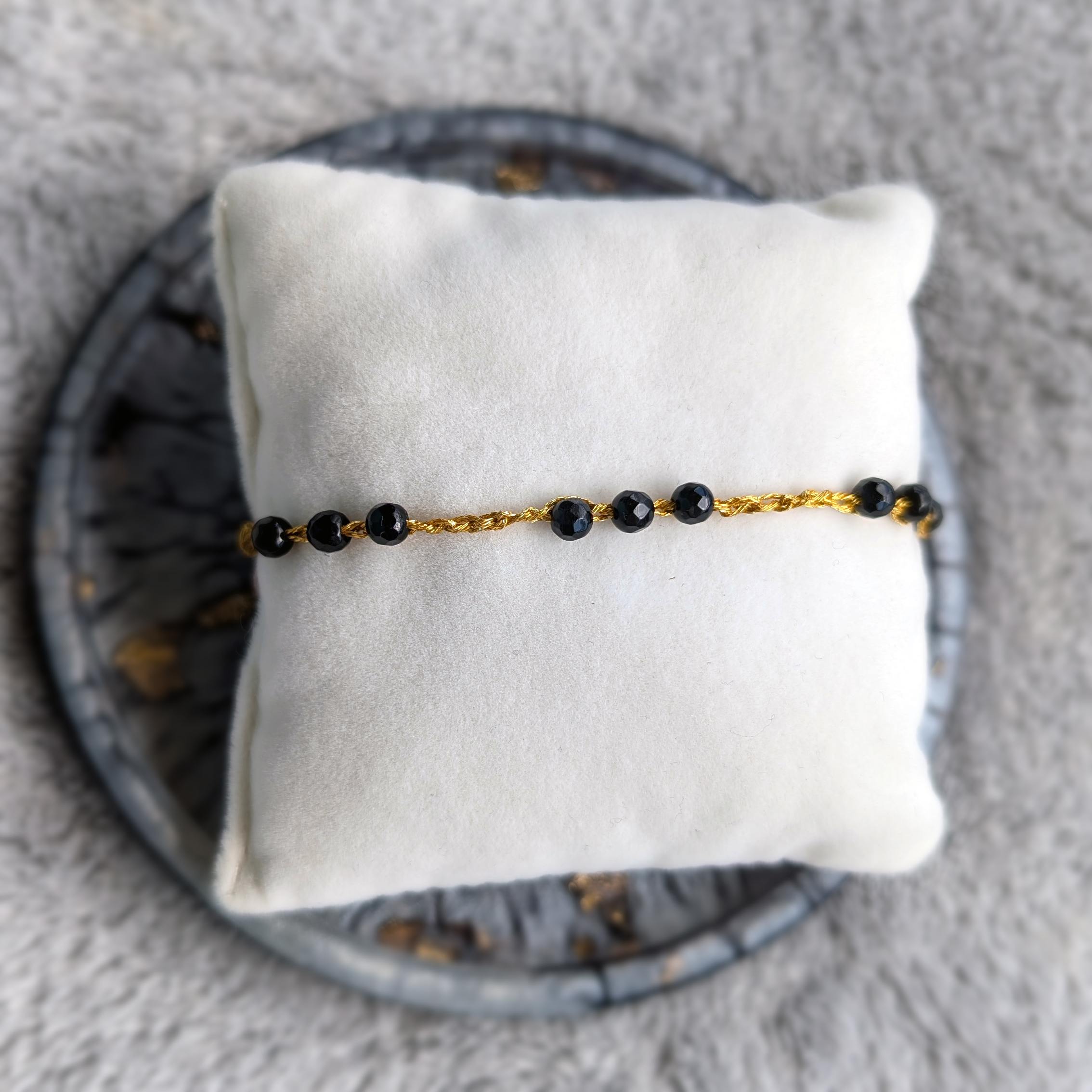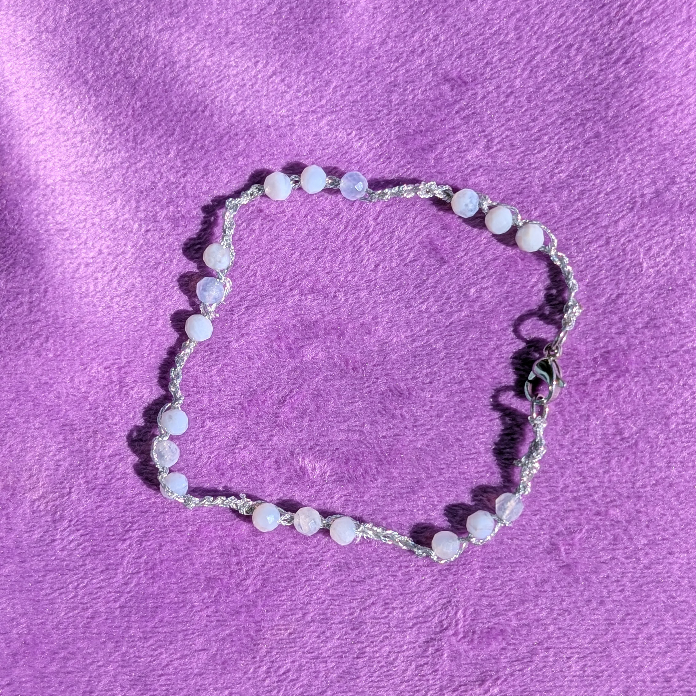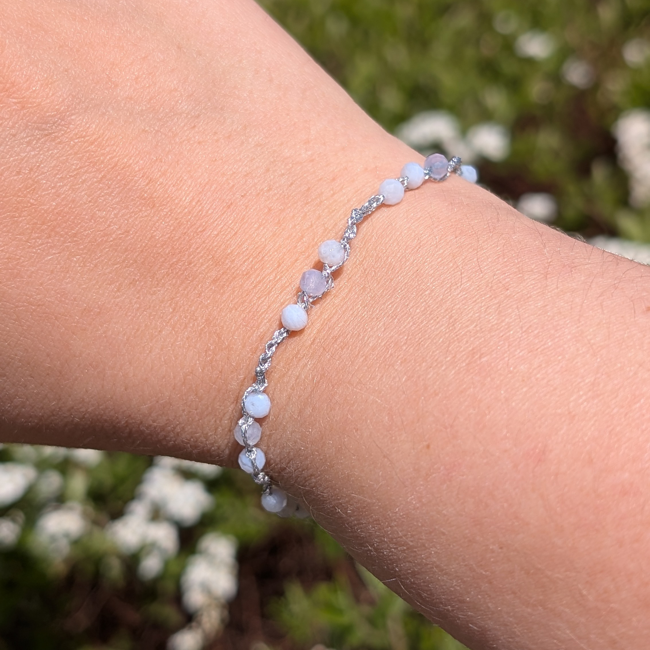 Bransoletki są wykonane ręcznie na cienkim szydełku z nici metalizowanych i kamieni naturalnych lub szklanych koralików. Posiadają elementy ze stali chirurgicznej (zapięcia, przekładki).