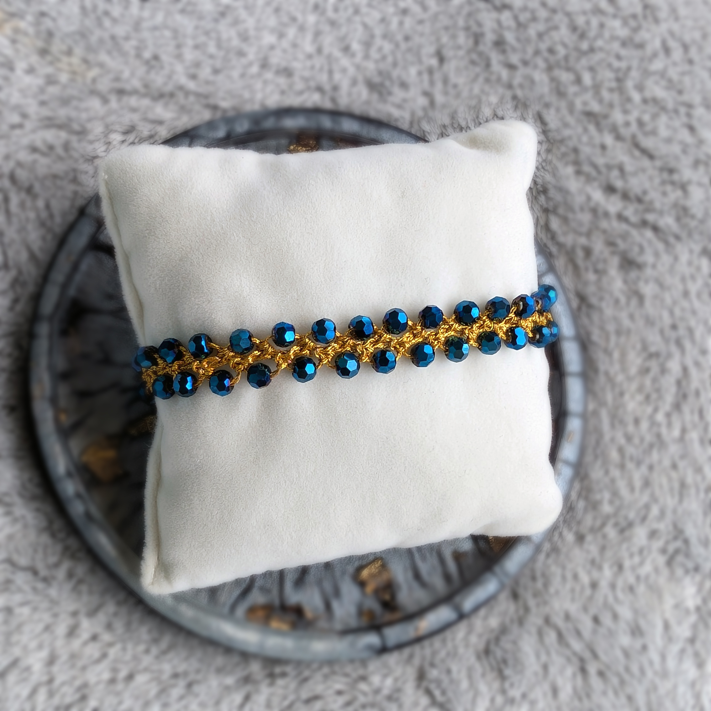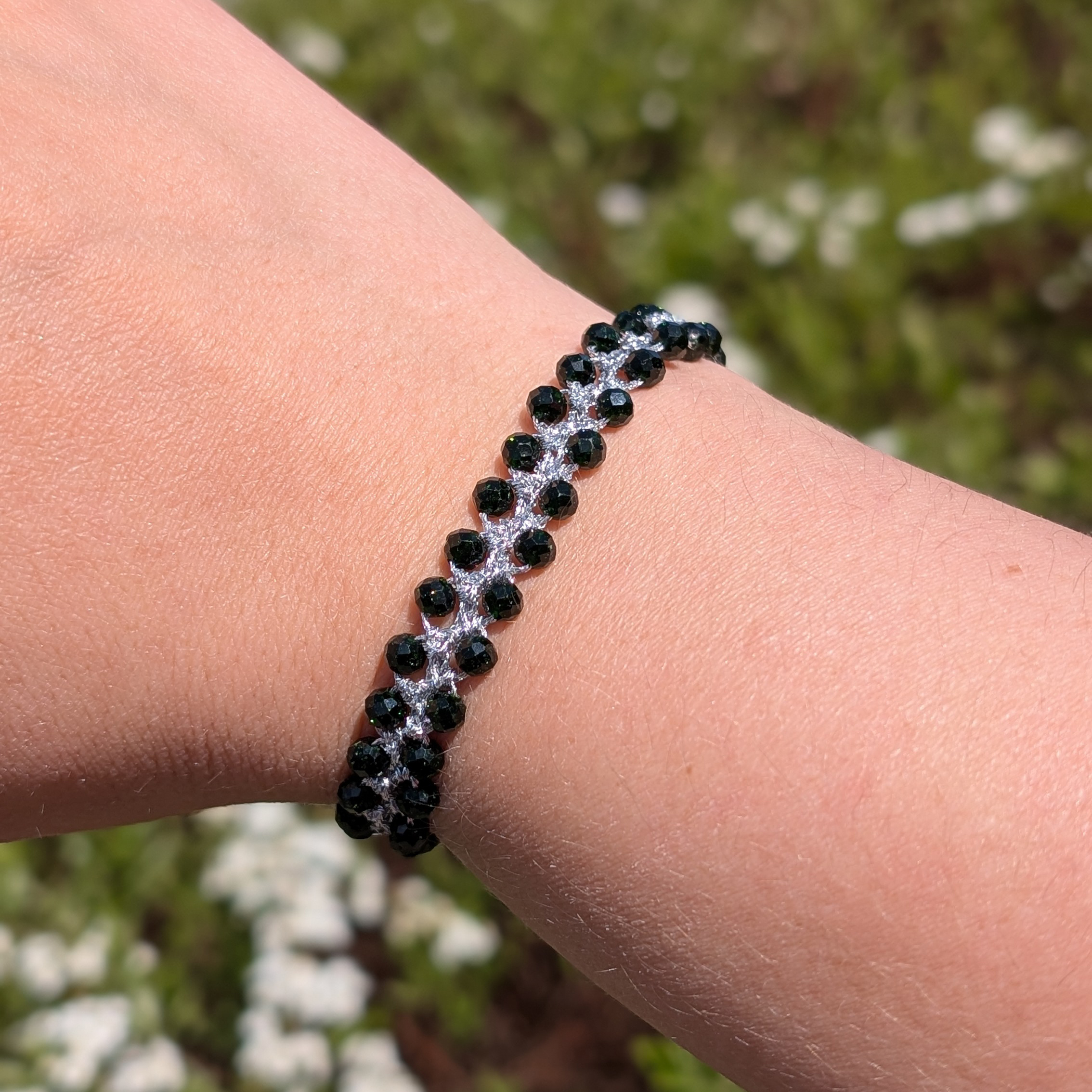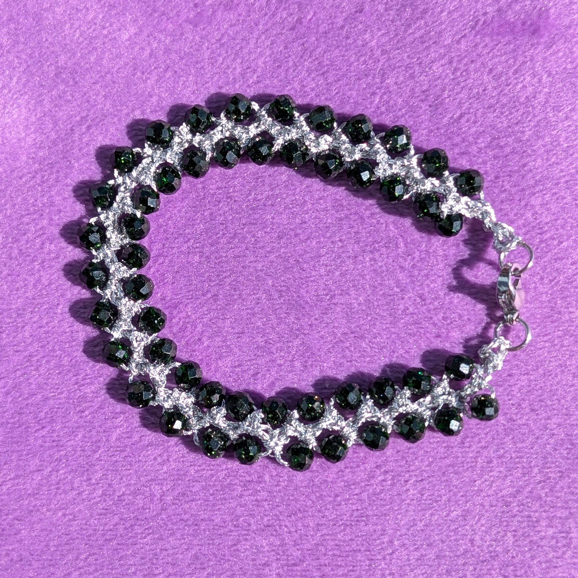 Bransoletki są wykonane ręcznie na cienkim szydełku z nici metalizowanych i kamieni naturalnych lub szklanych koralików. Posiadają elementy ze stali chirurgicznej (zapięcia, przekładki).