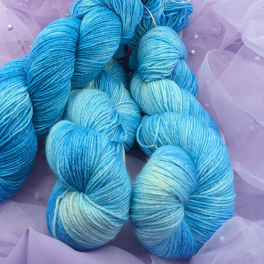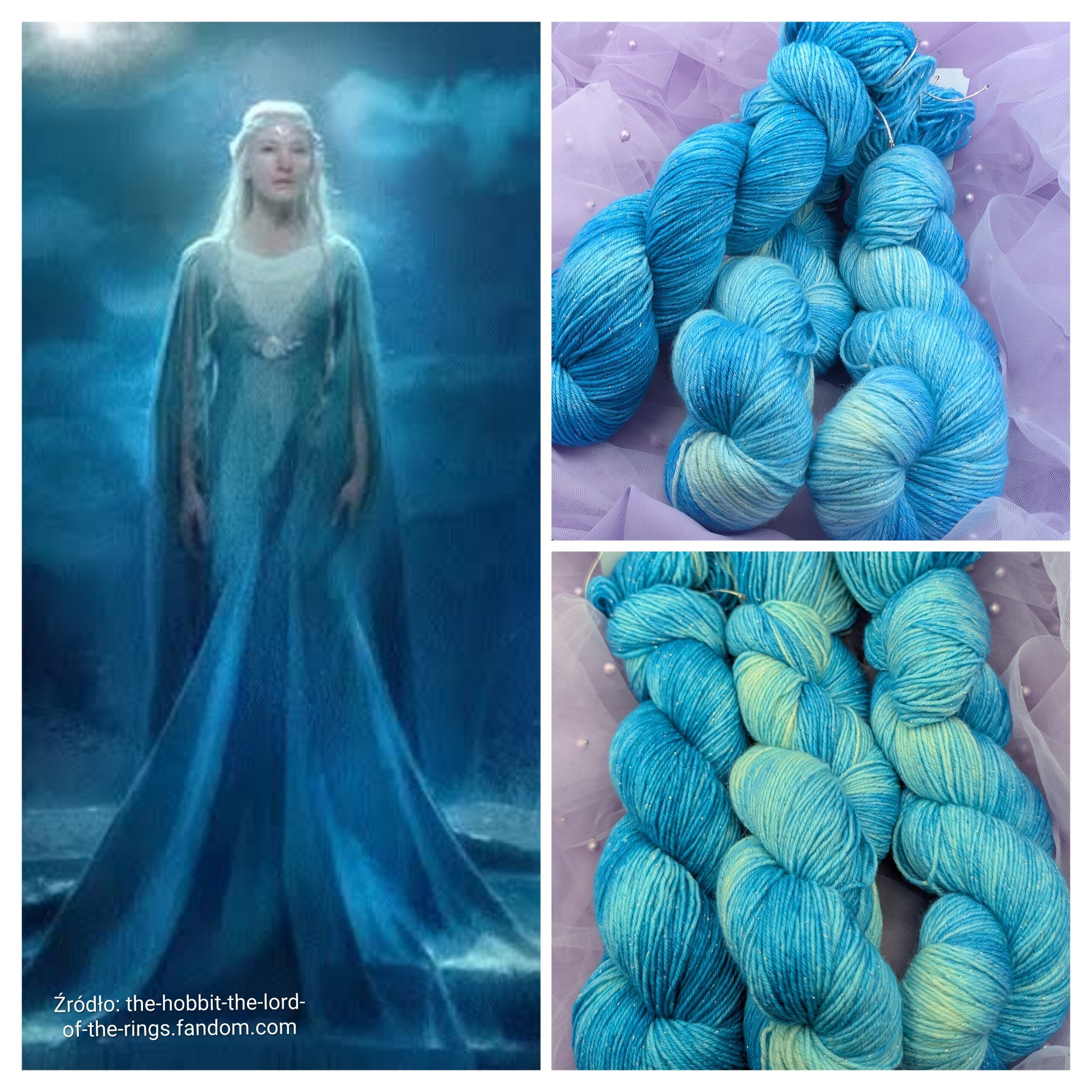 Włóczka w kolorach eterycznego błękitu, magicznego niebieskiego i delikatnego turkusu inspirowana postacią Galadrieli z uniwersum Władcy Pierścieni.