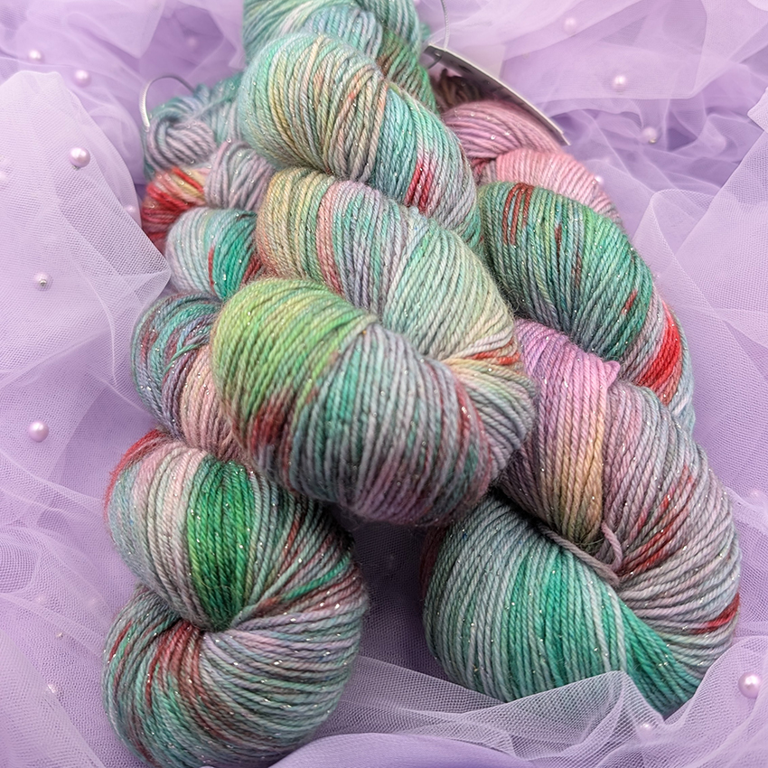 Ręcznie barwiona włóczka na bazie skarpetkowej z błyszczącą nitką.